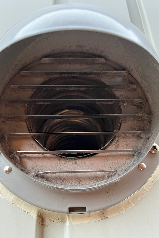 鳥の侵入を防ぐため、ルーバー付きのフードが採用されていますが、ここに湿気・洗濯物の埃・洗剤成分などが混じった汚れが少しずつ蓄積していきます。