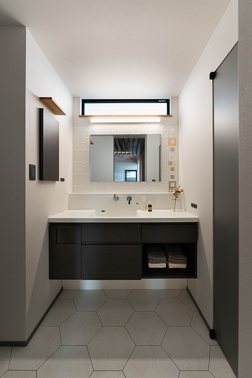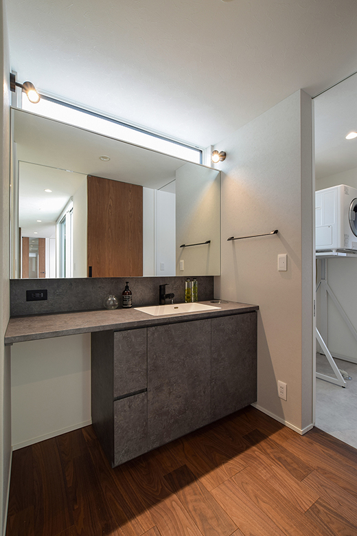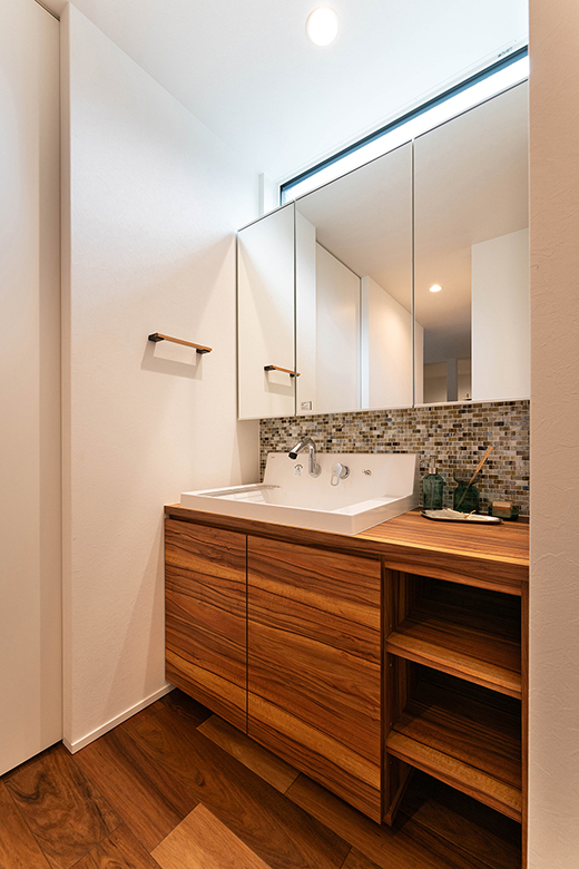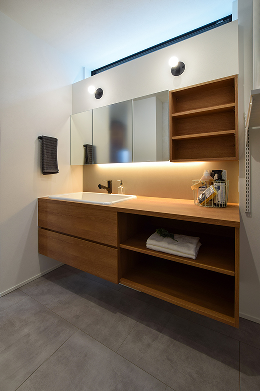 ミラーサイズや位置も自由に計画できるのは、造作洗面台ならではの魅力。