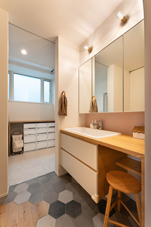 こちらの洗面台は、カウンター下に椅子を収納できるスペースを確保し、座って身支度ができるプランです。