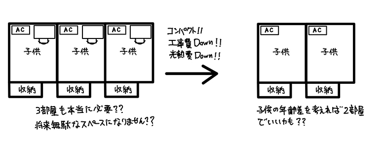でも上のお子さんが高校を卒業して家から巣立つ事を考えてみたら2部屋でもいいし、そっちの方が家も工事費もコンパクトにできますよね??