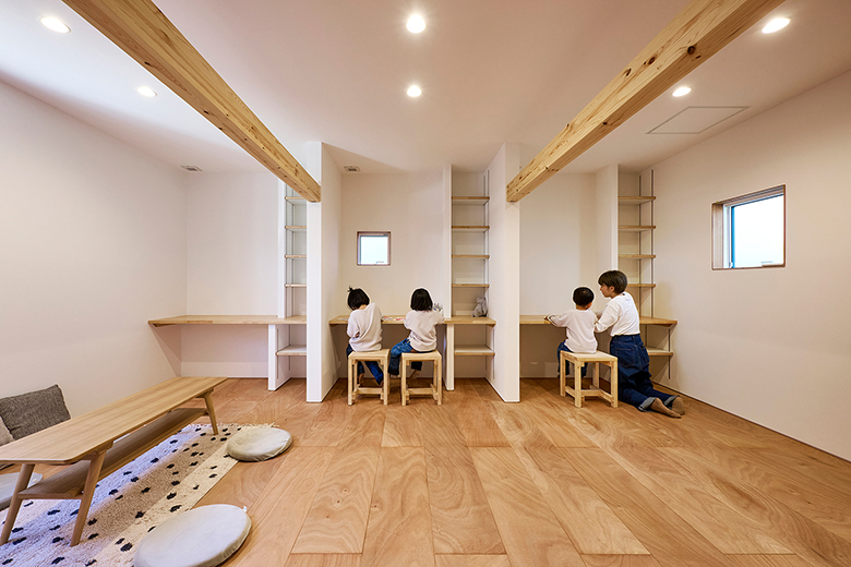そんな考えの発展版で、例えば収納をファミリークロークのようにまとめたり、机は各部屋にはおかず、共有スペースに幅のあるカウンターを付けてそこを時間差で利用する、みたいな間取りにするとどうでしょう??