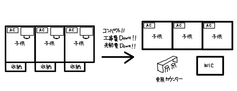 部屋数が少なくなれば建具やACなども少なくできるので、家のボリューム以外にも工事費がコンパクトになります!!