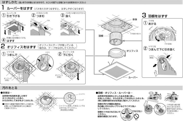 ※お手入れが完了したら、羽根・オリフィス・ルーバーの取り付けを確認して、分電盤のブレーカーと電源スイッチを入れて動作確認をしてください。