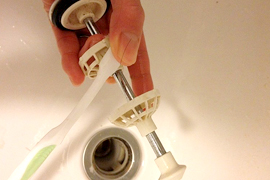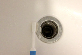 …排水口の中を浴室用中性洗剤をつけた歯ブラシでこすり、排水栓を元どおりはめ直して完了です。