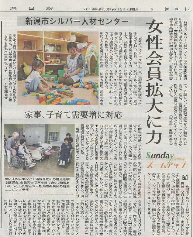 この度、新潟日報朝刊(2019年9月15日)に『シルバー人材センター』の女性会員拡大に関する記事に掲載され、弊社にてご支援いただいたいる場面が紹介されました。