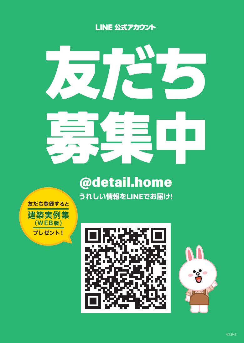 2020.09.29 LINEはじめました!お友だちになって最新情報をGETしよう♪ 平素は格別のご高配を賜り厚く御礼申し上げます。 この度ディテールホームでは、LINE公式アカウントを開始いたしました。 完成見学会やモデルハウスなど、うれしい情報を発信していきます。 友だち登録すると、WEB版の建築実例集をプレゼント! ぜひお友達登録してみてください。