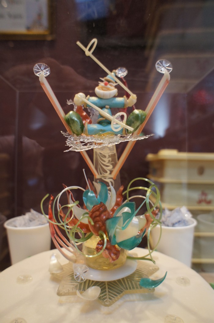 オーナーシェフはピエスモンテと呼ばれるパスティヤージュ(粉砂糖、卵白、ゼラチンあるいはトラガント・ゴムを練って作ったもの)に