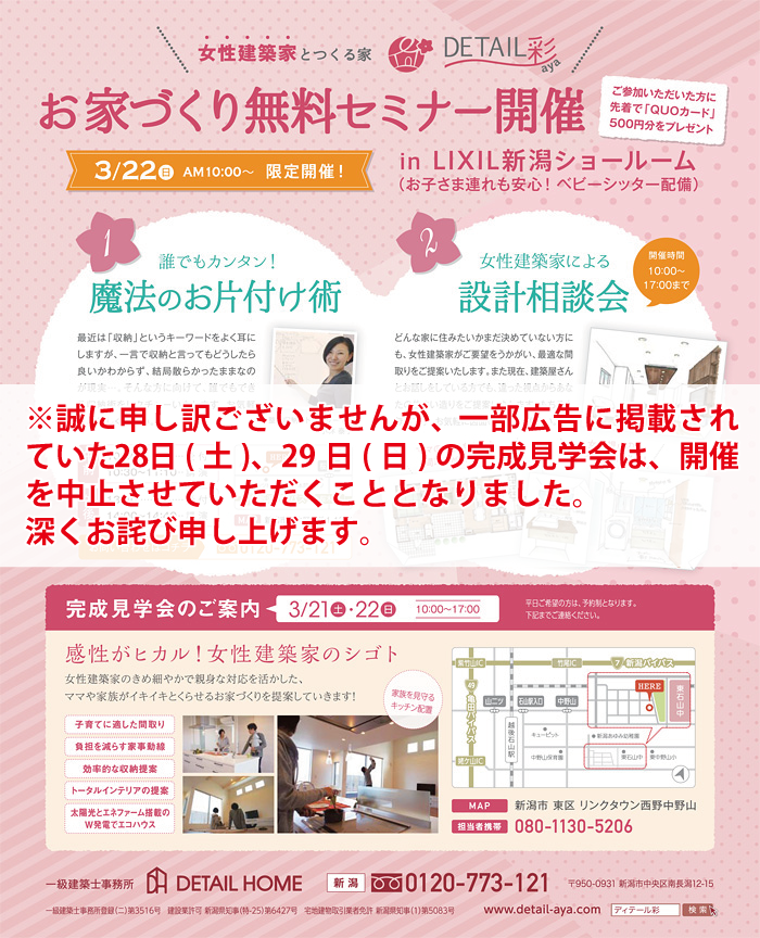 【開催終了】完成見学会【3/21(土)・22(日)】・お家作り無料セミナー【3/22(日)】