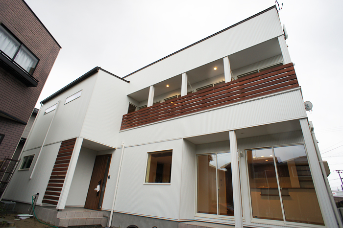 白いガルバリウムに木目をアクセントにしたシンプルモダンな外観
