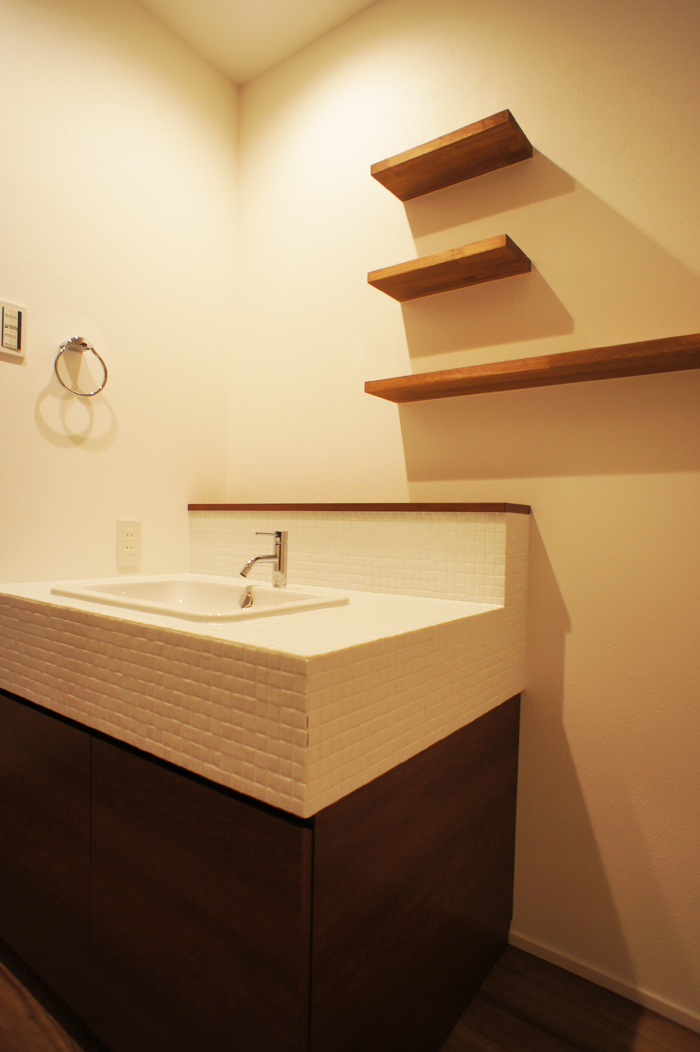 2階の洗面化粧台はモザイクタイルを貼ったかわいい造作化粧台。水回りにとことんこだわった逸品