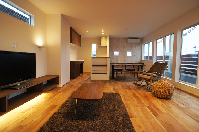 2階LDKの床にオーク無垢材を使用。木目や色1つ1つに個性があり、使い込むほどに味わいやぬくもりが深まります。飽きのこないシンプルなLDK