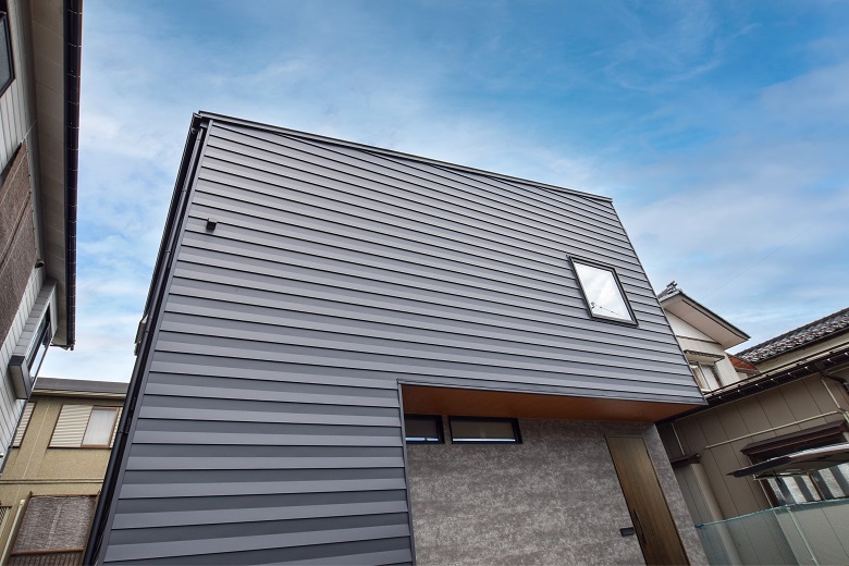 色を統一しながらも、ガルバリウムとサイディングで素材を変え表情をつけた外観。