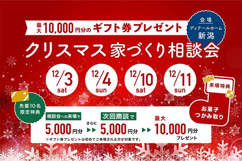 【開催終了】≪最大10,000円分のギフトカードがもらえる≫クリスマス家づくり相談会|ディテールホーム新潟南長潟・新潟神道寺【完全予約制】