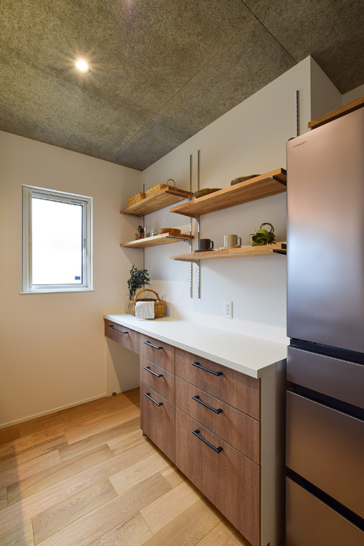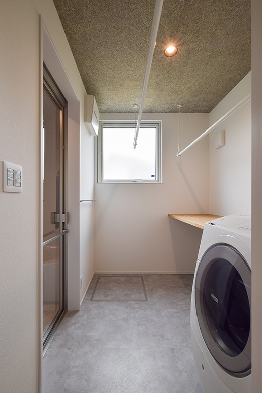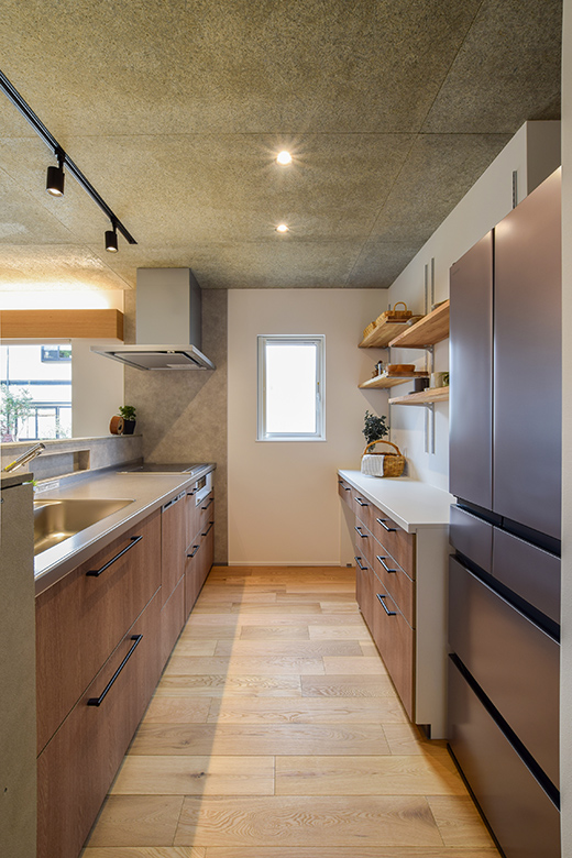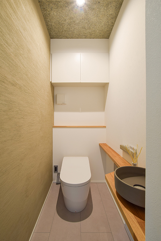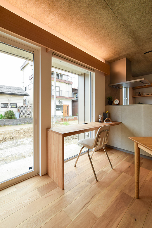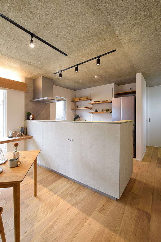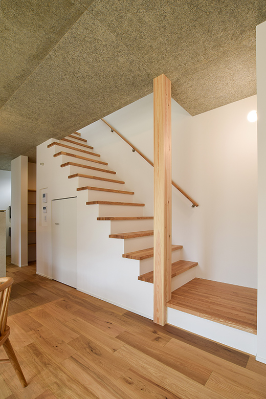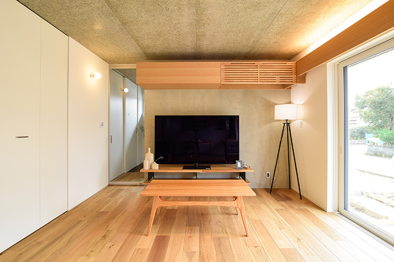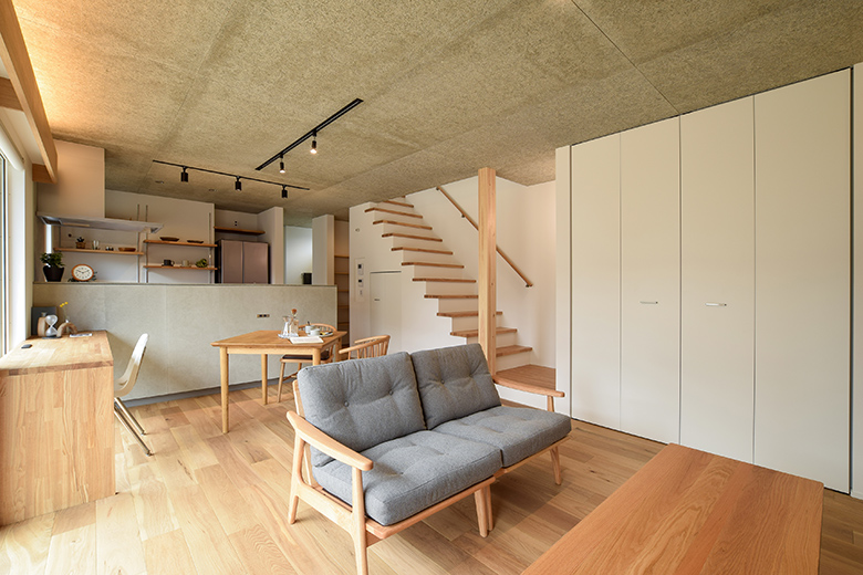 オークにSOLIDOや木毛セメント板のグレーを合わせたシンプルで素材を楽しむ家。