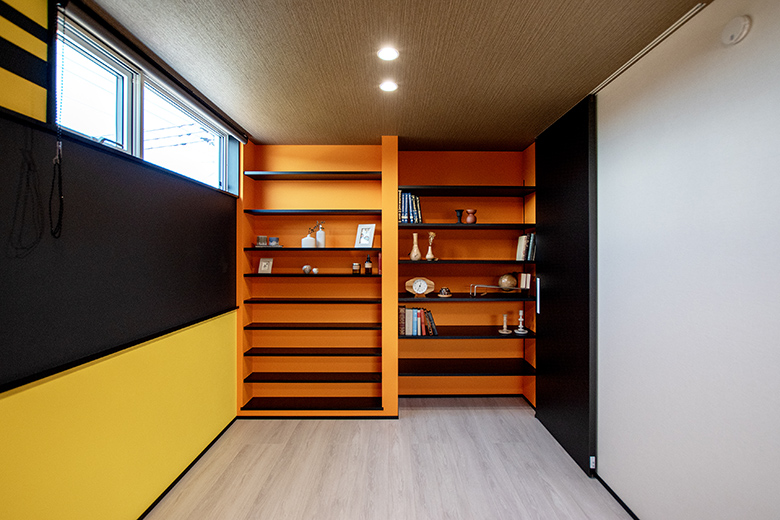お施主様の好みのテーマを固めた壁紙・床の色使いは見どころ。