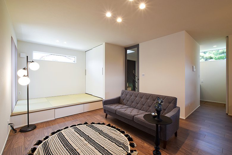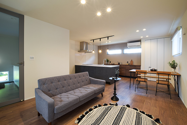 三条市|ブラックタイル×ウォールナットの床が魅せる、シックな23帖リビング|完成見学会【予約制】