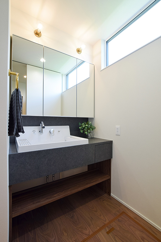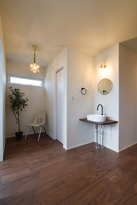 床材はドライウォルナットとモルタル調でシンプルにまとめた。