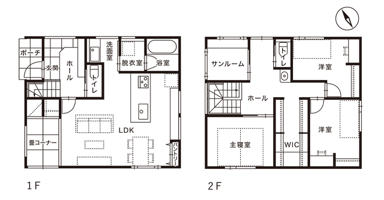 2階には大容量WIC、1階には必要なものを各所に配置できる分散収納を計画。隠す収納で生活感を無くした。