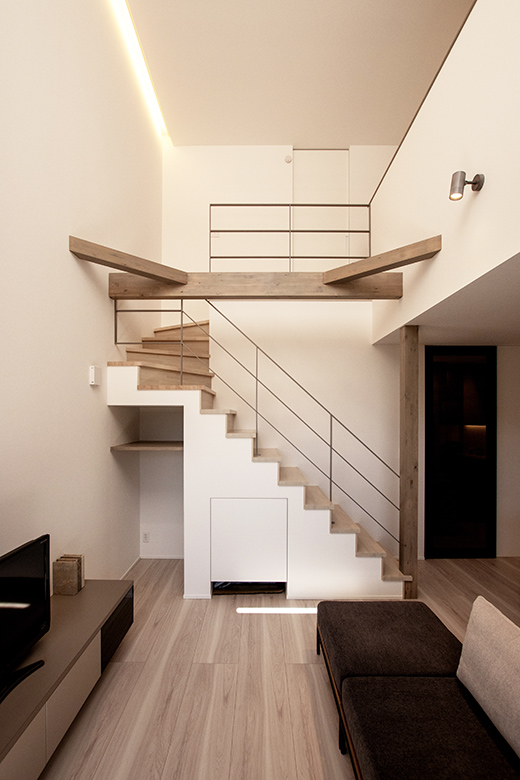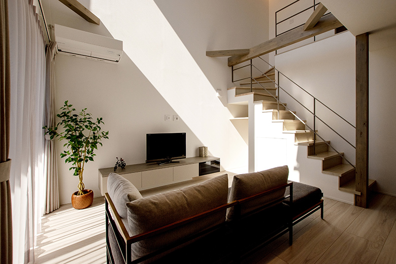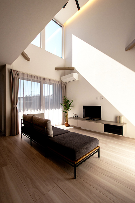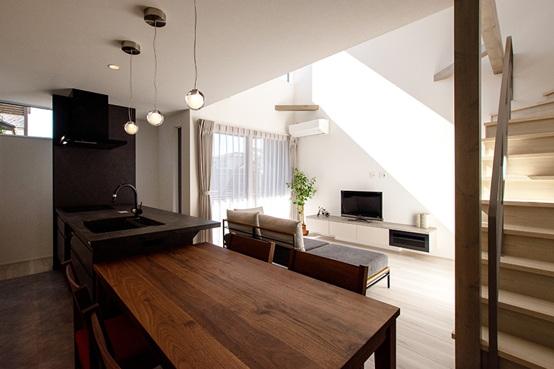 新潟市江南区|1.5階の高天井とカーテンレスのLDKで、海外照明と家具が映える住まい|完成見学会【予約制】