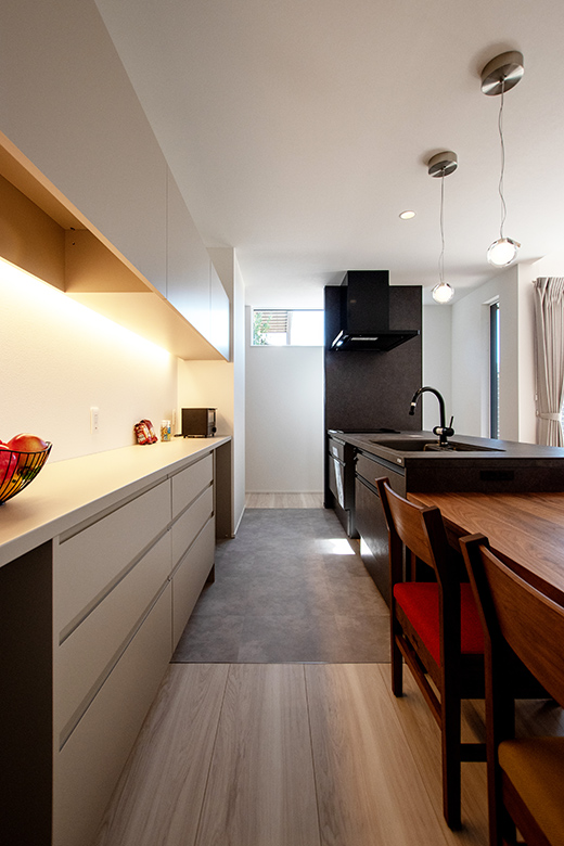 収納を丁寧に繋ぎ、実現した回遊動線はそれは使いやすく、ほどよく隠せる。