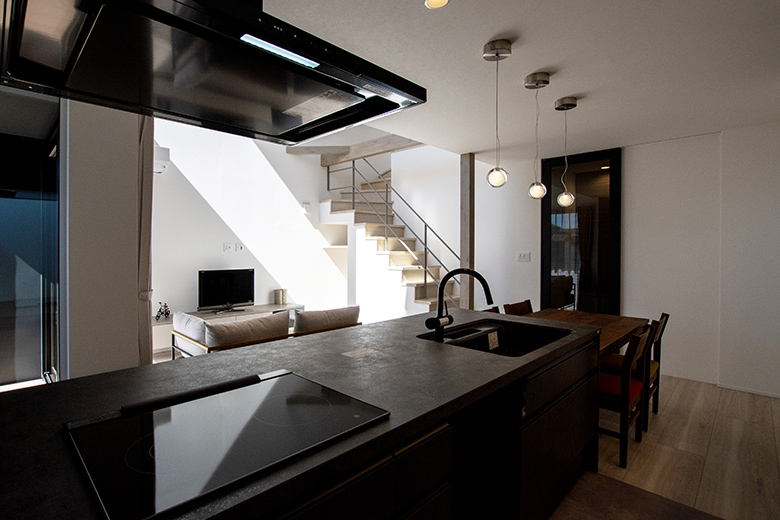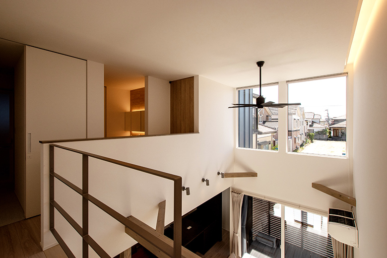 立地条件ではその一角の開かれた方位を利用し、プライバシーを担保しながら大開口と吹抜けにより抜け感を出している。