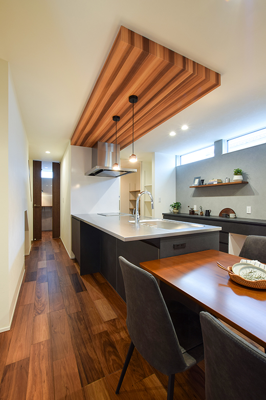 家事負担を軽減するキッチンや水回りへの動線など、将来的にワンフロアとして使う事も想定した、家族がいつでも集まりやすいレイアウト。
