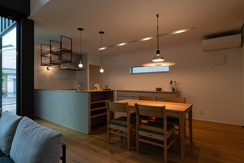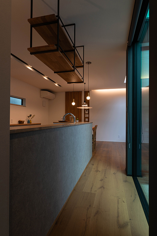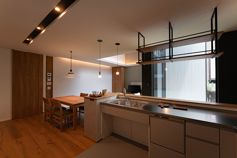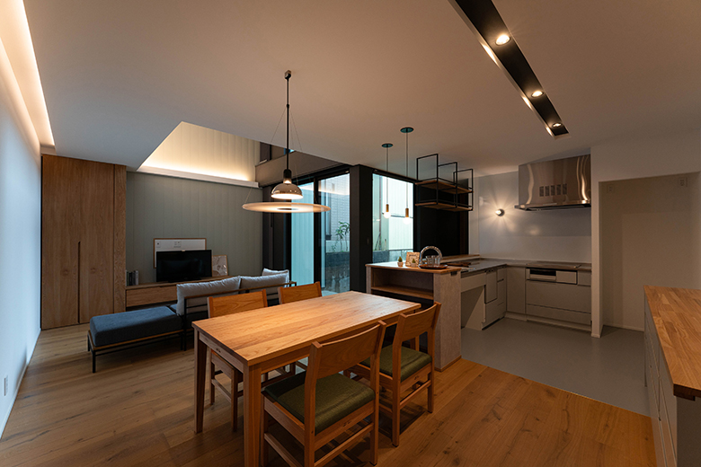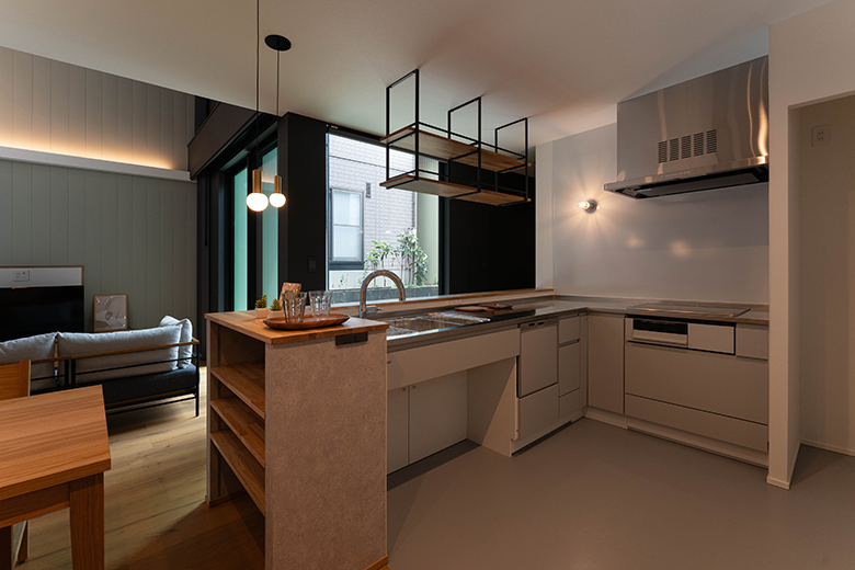 中庭のようなお庭スペースを確保するため、間取りをL型に設計、キッチンも珍しいL型キッチンを採用。