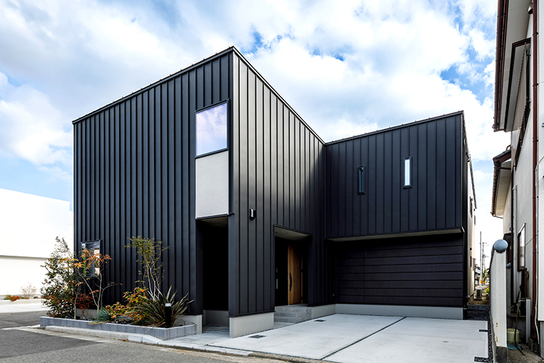 金属と塗壁、タイルと窯業など素材を散りばめながら統一感を持たせた外観。