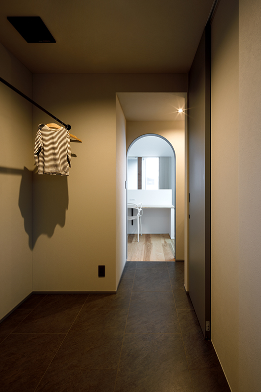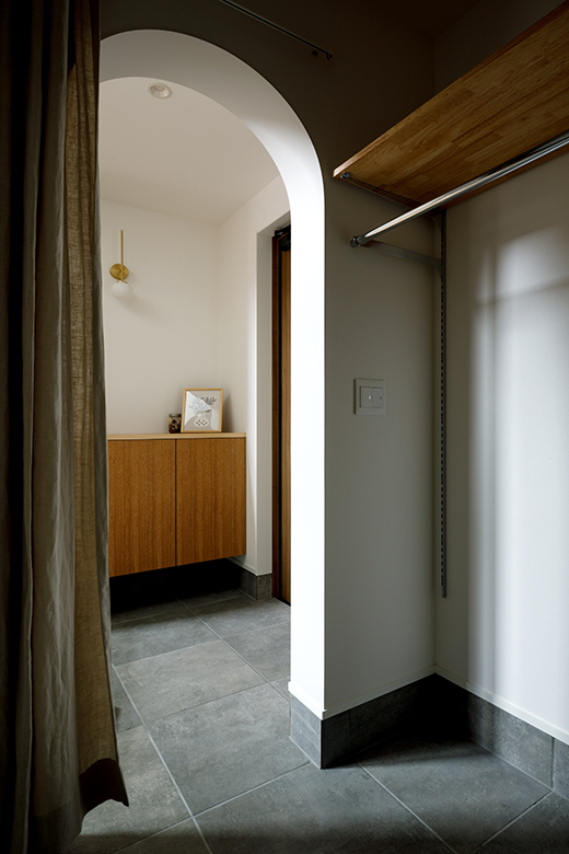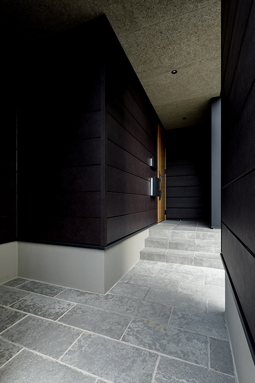 あえて光の差込みを抑えた「洞窟アプローチ」は、駐車スペースからアプローチにかけて全天候対応。