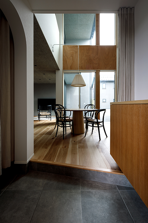 落ち着いたアプローチとは対照的に、玄関を開けると光が差し込む、開放的な「吹抜けダイニング」。