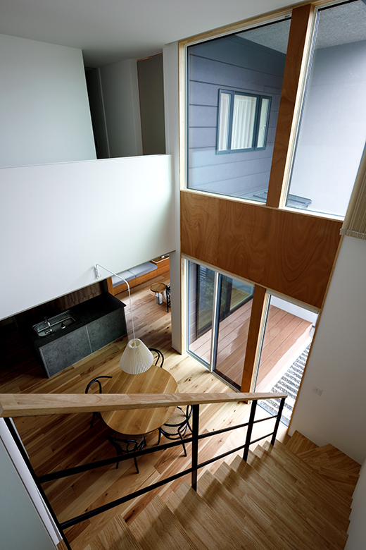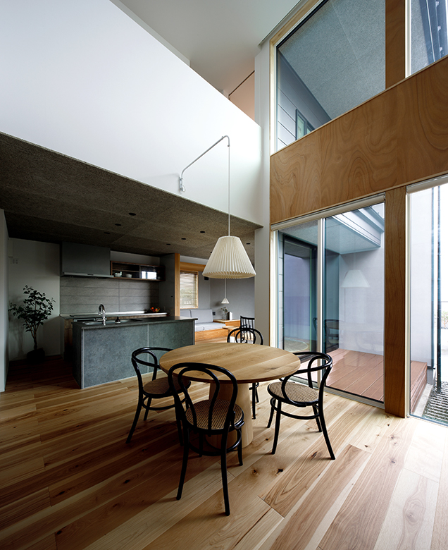 40坪台と決して広くない敷地に、駐車スペース3台を計画しつつ、密集した住宅地での開放感とくつろぎの空間を目指した。