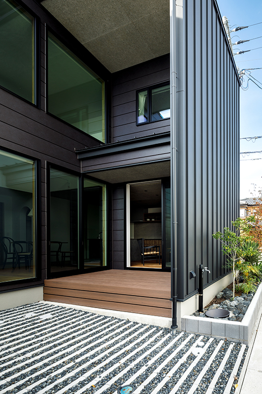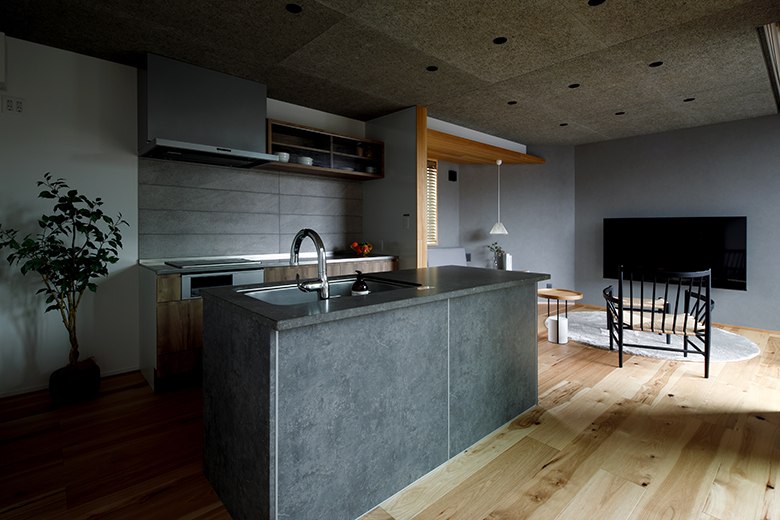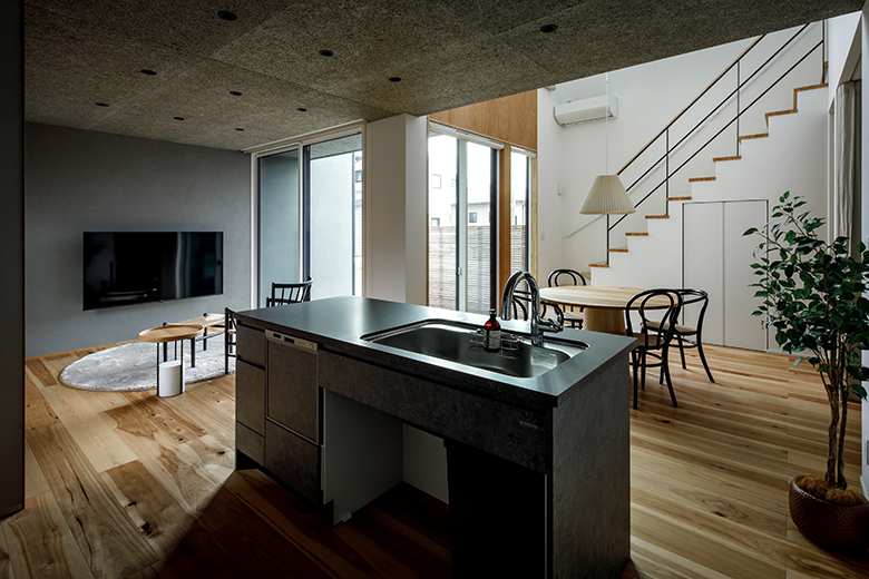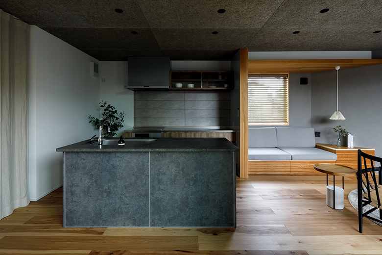 アイランドキッチンや造作ソファなど、家の個性が際立つ要素は勿論、加えて外観形状により、外からの視線をコントロールした外部空間をデザイン。