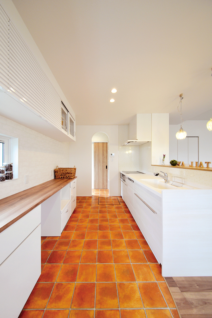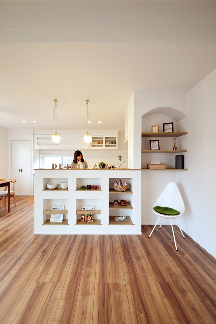カフェスタイルをイメージした飾り棚と、アイアン金物が彩るMAMA目線の空間設計。