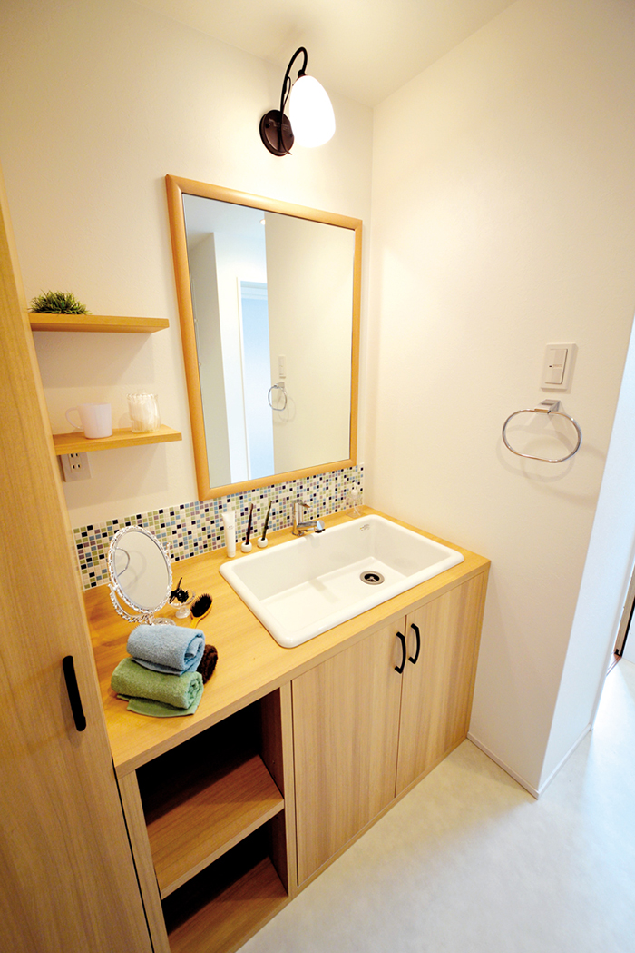 鮮やかなタイルをあしらったデザイン性と機能性を兼ね備えた造作洗面化粧台。