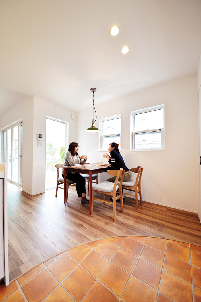 モスグリーンのペンダントライトが印象的なダイニングは女子会にピッタリの明るい雰囲気。
