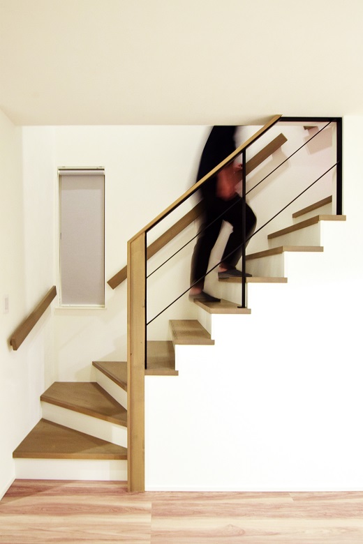 (奥様)階段の手すりも好きなんですよね。四角っぽいデザインがいい。