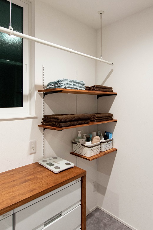 つなぎなどの長物を干すことを想定して、物干し下の収納スペースをあえて一部空けておいたんです。