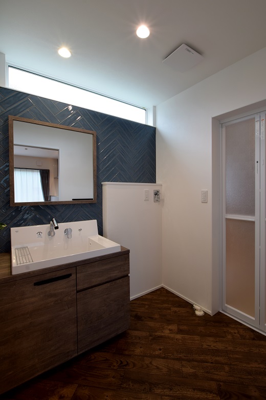 (奥様)テレビ台の背面には白いタイル、洗面台にはブルーのタイルをヘリンボーン張りにしてもらいましたが、これも提案してもらったものなんです。