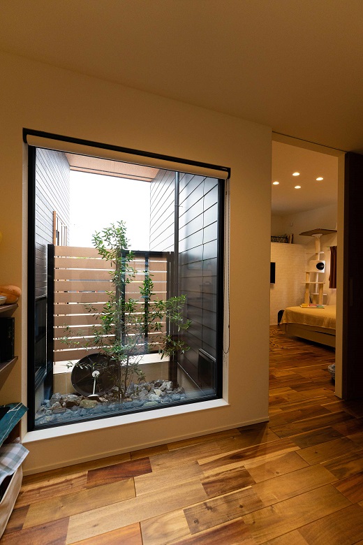 「キッチンから寝室にいる猫を見たい」と言ったら、キッチン脇の大きな窓から寝室の地窓を見えるようにしてくれて。