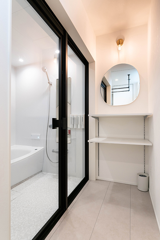 家事動線側からは見えにくい、絶妙な向きでお風呂の入り口を作ったことで、このデザイナーズ空間が実現。