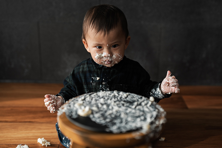 この間も、SOLIDOの壁を背景にして、1歳の誕生日にスマッシュケーキと一緒に撮影しました。