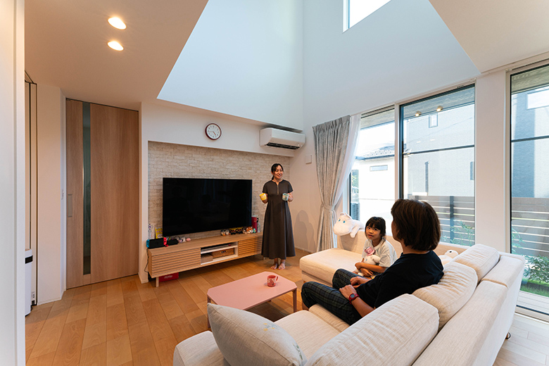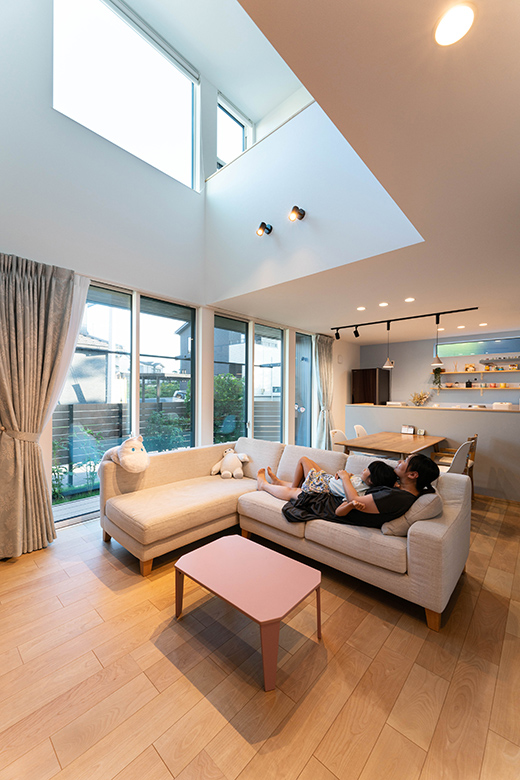 (奥様)リビングで寝転んだとき、吹き抜けの窓から見える空が好きです。