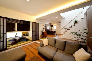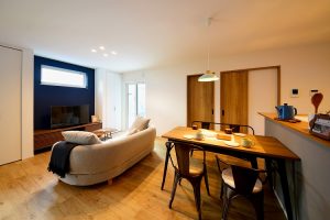 新潟市江南区|1.5階の高天井とカーテンレスのLDKで、海外照明と家具が映える住まい|完成見学会【予約制】