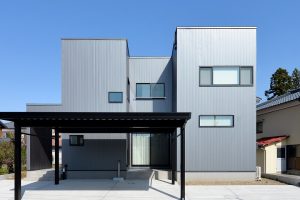 金属の外壁をメインとして、シャープな外観とした。オーバーハングさせた部分から雨に濡れず車に乗り込める