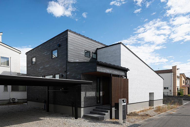外壁にはケイミューのSOLIDOとフィエルテの2種類を使用。ポーチには目隠しにもなるルーバーをアクセントにつけた