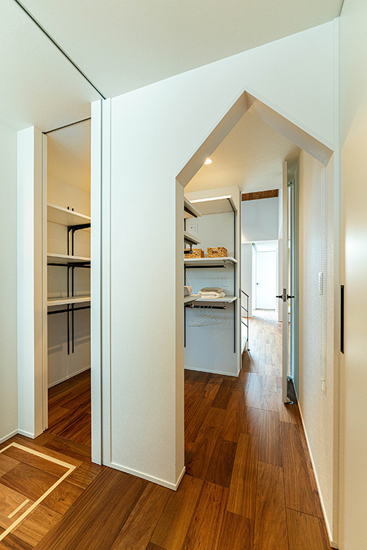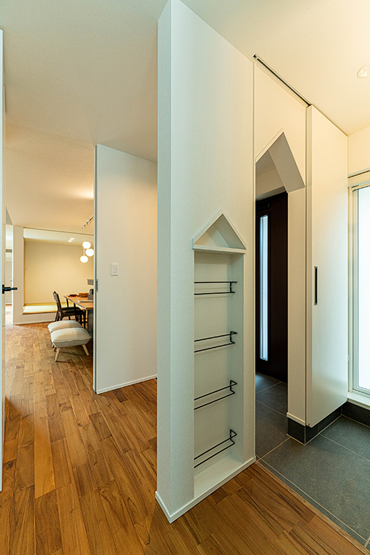玄関入ると右側はLDK、左側は水回りへ。シューズクロークとの間には三角の垂れ壁で空間に変化をつけた