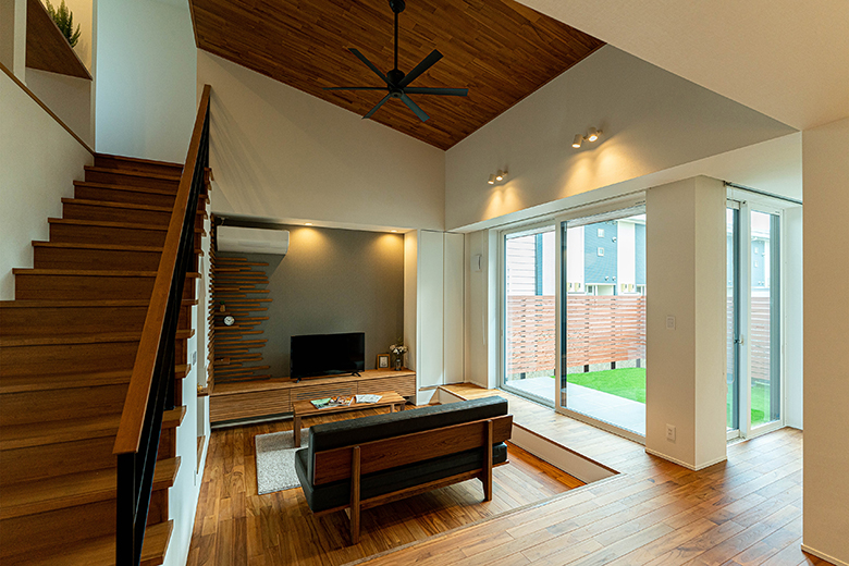 BBQができる中庭を中心としたコの字型の間取り。ダウンフロアにすることで、リビングを囲んで座れるようにした