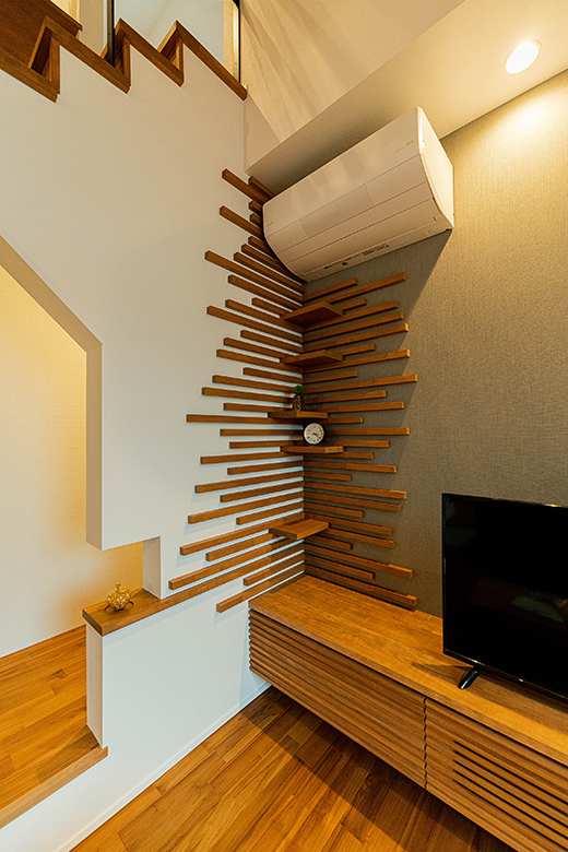リビングの角にある壁のデザインと一体化した飾り棚。ヌックの入り口にはマグカップ置き場も