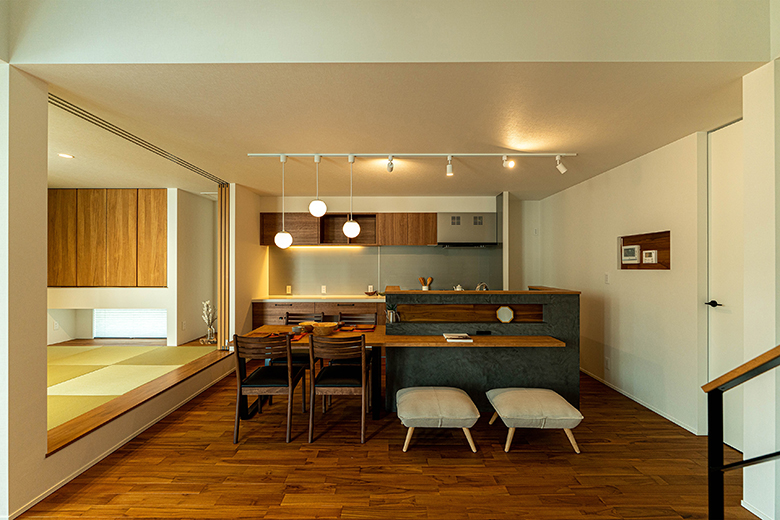 ダイニング隣の和室。吊り戸棚と3枚引き戸を同じ木目の扉に造作した