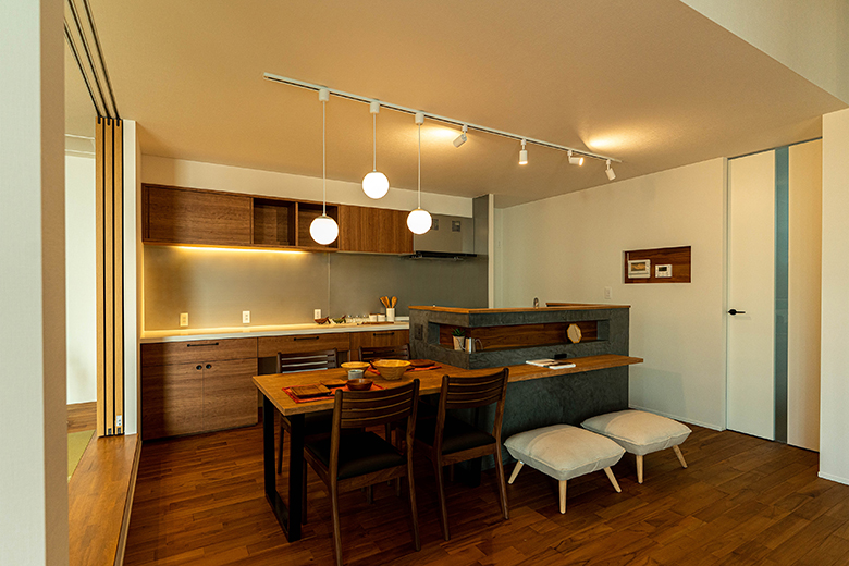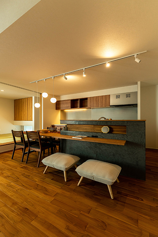 カウンターまで一枚板でつながっている造作ダイニングテーブル。モールテックスの腰壁には小物を置けるニッチを造作